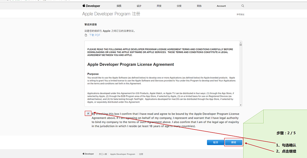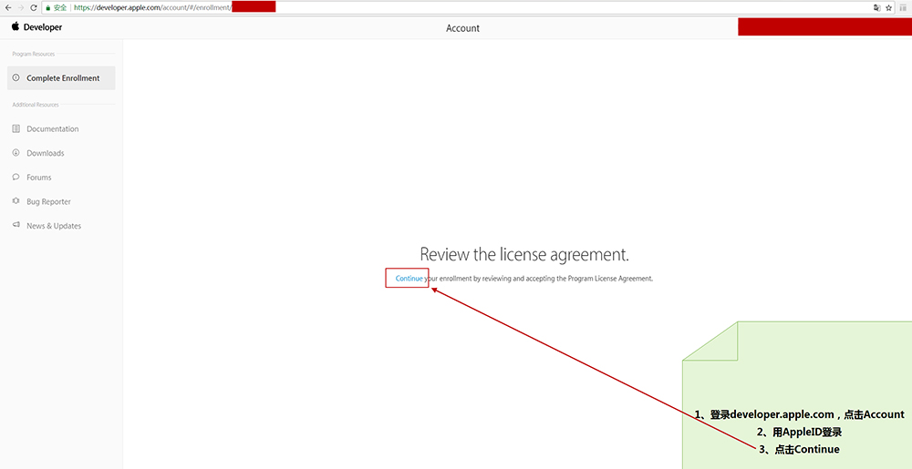 第一步:登錄 developer.apple.com,點(diǎn)擊 “Account”;點(diǎn)擊 “Continue”