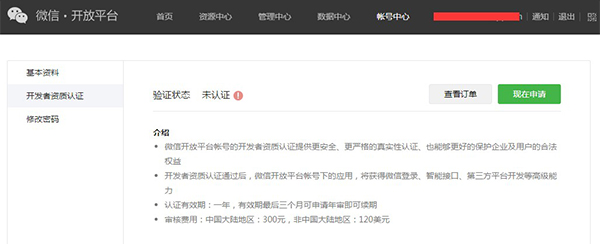 4.注冊完成后,點擊首頁,選擇登陸,在彈出的登錄框中輸入郵箱和密碼,點擊登錄則進入你開放平臺的管理中心。點擊賬號中心,選擇開發者資質認證,此時可以看到驗證狀態是“未認證”狀態,需要申請認證,否則無法完成后續應用支付渠道申請的操作。點擊“現在申請”按鈕,進入申請頁面。