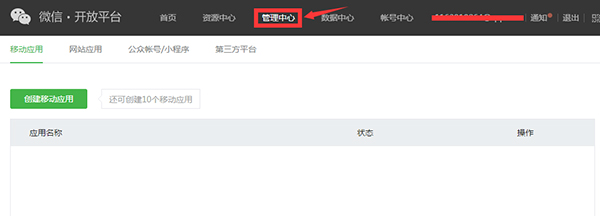 8.登錄進入微信開放平臺后,點擊管理中心,在管理中心頁面中選擇創建移動應用,填寫上移動應用的相關信息后,提交即可進入等待微信審核的過程中,審核時長大概 2-3 個工作日。