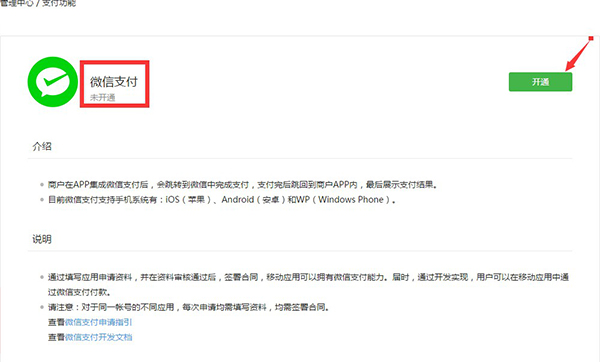 10.在應用詳情頁面找到“微信支付”一欄,點擊“申請開通”按鈕。在申請開通頁面可以看到微信支付是未開通的狀態,點擊“開通”進入提交資料頁面。