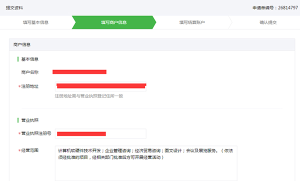 11.在提交資料頁面中填寫基本信息、商戶信息和結算賬戶的信息后確認提交。又進入漫長的審核等待過程,這個過程大概 1-5 個工作日。信息沒有提交錯誤的話一般都能審核通過。