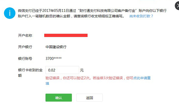 14.登陸進入商戶中心后進入支付申請頁面,點擊驗證按鈕會彈出一個驗證頁面,輸入給你手機發送的微信給您的銀行卡轉賬的金額,如果輸錯會彈出警告信息。輸入完點擊“確認” 按鈕即可。