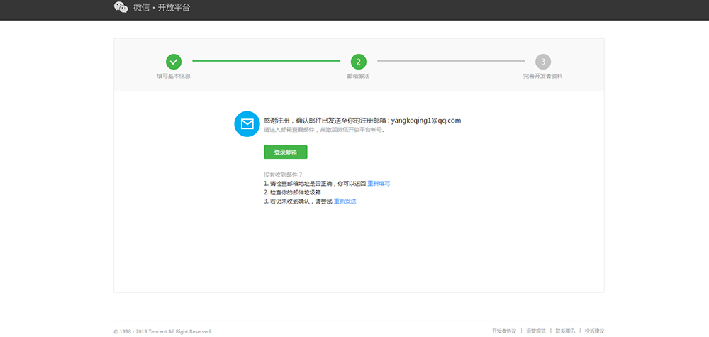 3.激活郵件后,在完善開發者資料頁面中根據提示填寫對應信息,需要注意的是掃碼驗證管理員身份時,需使用綁定了注冊人本人銀行卡的微信掃描二維碼。否則不通過。點擊“完成”后,注冊完畢。