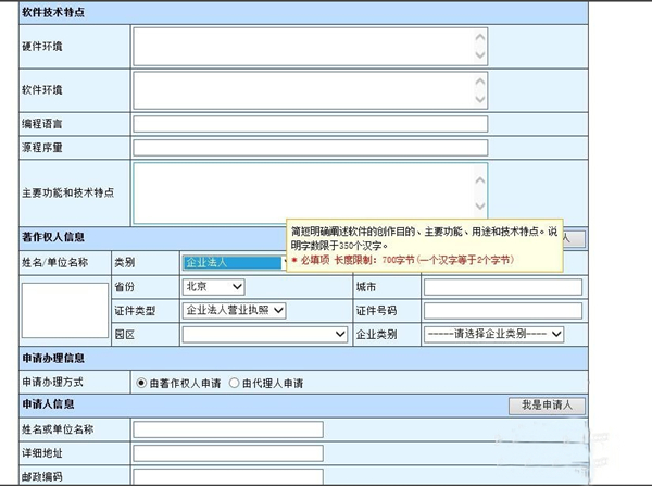 登錄進(jìn)去后,點(diǎn)擊“我要登記”- R11.計算機(jī)軟件著作權(quán)登記申請,出現(xiàn)計算機(jī)軟件著作權(quán)登記申請表,按照要求填寫即可。需要注意的是,有時瀏覽器會因?yàn)榧嫒菪缘膯栴}無法顯示備注,這種情況建議換一個瀏覽器,否則申請會無法提交。此外,申請辦理方式中的“由代理人申請”一般是代理公司辦理時使用,如果你是個人或者是企業(yè)的經(jīng)辦人員,直接選擇“由著作權(quán)人申請”即可。